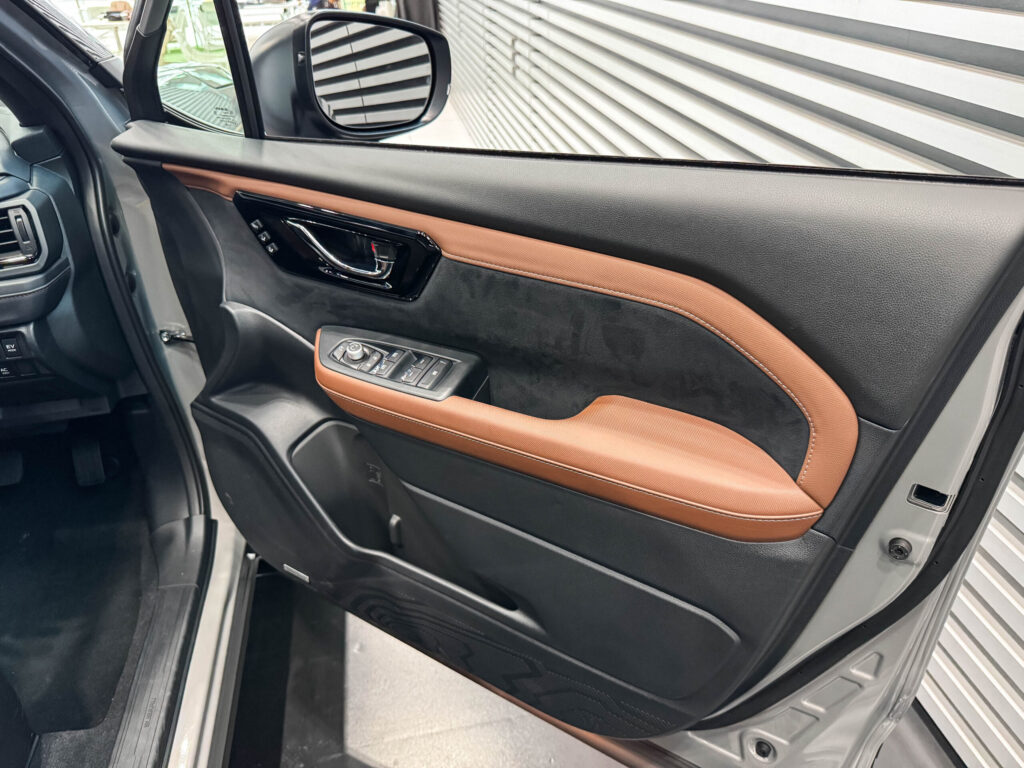 ドアトリムは、本革調素材とソフトパッドを中心に構成されています。いわゆる高級車らしい強い光沢は抑えられており、ややマット寄りの質感です。指で触れるとしっとりとした感触があり、価格帯以上の上質さを感じさせます。