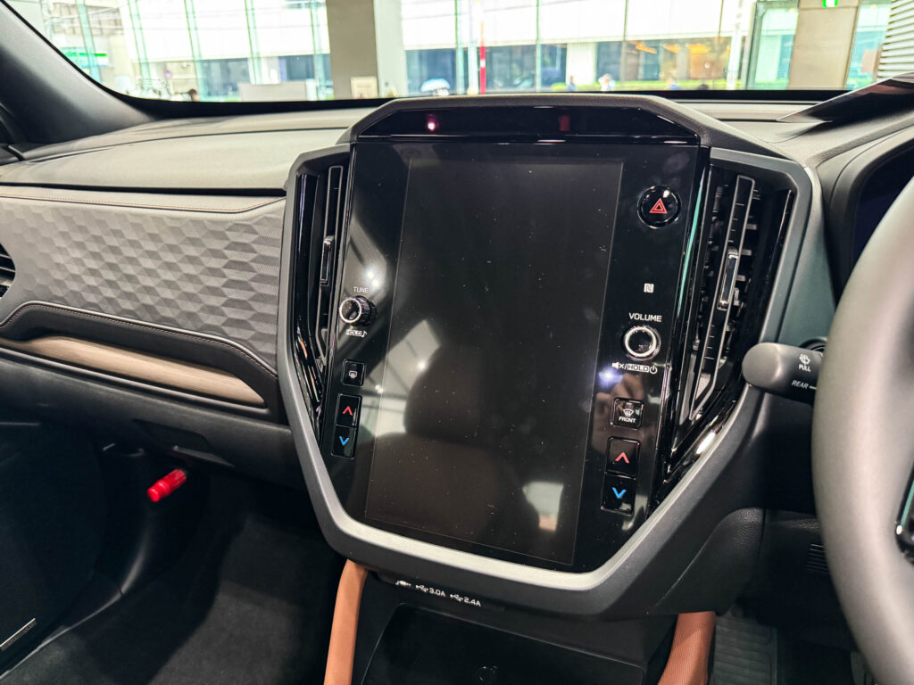 下段にあるAC100V(1500W)の電源スイッチも見逃せません。ストロングハイブリッドの電力を活かし、キャンプや災害時に電化製品を使えるこの装備は、フォレスターの実用SUVとしての価値を一段引き上げています。