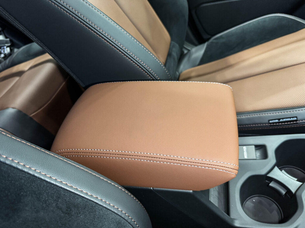Premium S:HEV EXのセンターコンソールに触れて、まず印象に残るのがアームレストの出来の良さです。ブラウン系の張り地はシートとしっかり統一されており、触れたときの質感も柔らかめで上質です。表皮のきめが細かく、ステッチも控えめなので、主張しすぎず落ち着いた雰囲気にまとまっています。