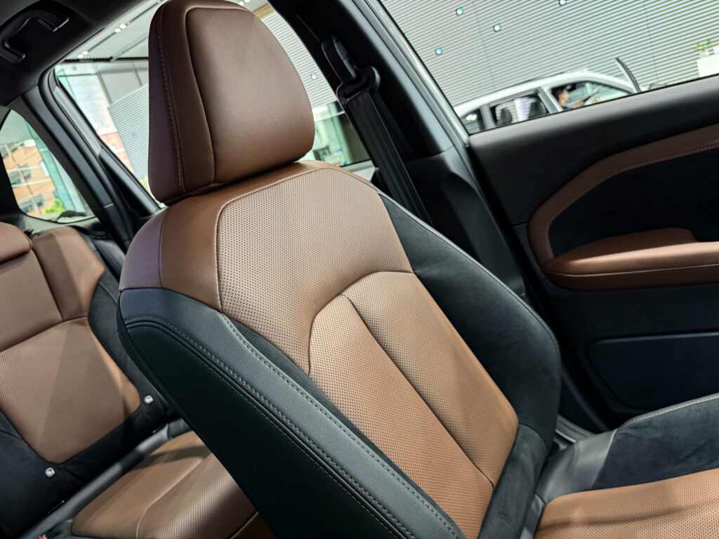 写真からも分かるように、ブラウンを基調としたシートは見た目の上質さが際立ち、室内の印象を大きく引き上げています。中央部にはパンチング加工が施され、サイドにはウルトラスエード®を組み合わせることで、視覚的にも触感的にもワンランク上の仕立てです。