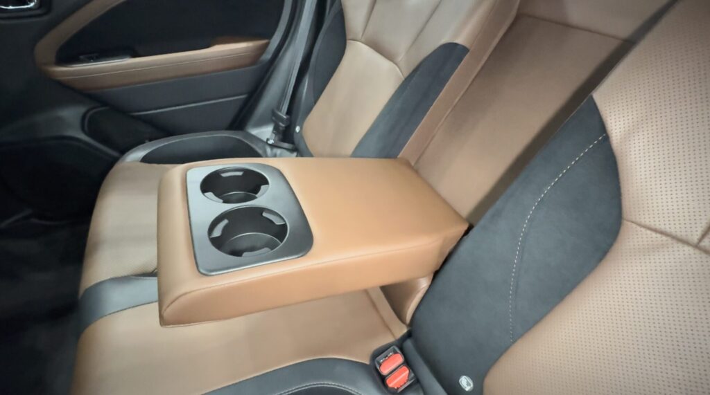 アームレストはセンターシートから倒すタイプで、ナッパレザー/ウルトラスエード®の質感とよく馴染む仕上がりです。肘を置いたときに硬さを感じにくく、ちょうどいいクッション性があり、長時間のドライブでも自然に腕を預けられます。
