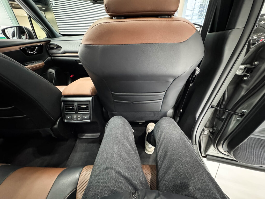 Premium S:HEV EXの後部座席に座ってまず感じるのは、前席との距離のゆとりです。私の身長168cmですが、運転席と助手席を大人の標準的なドライビングポジションに合わせた状態でも、膝の前にはしっかりと空間が残ります。