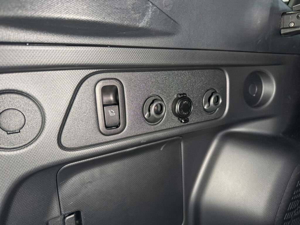 トランクの左側を見ていきますと、後部座席をワンタッチで倒せるレバーとフック、そして12Vのソケット電源があります。