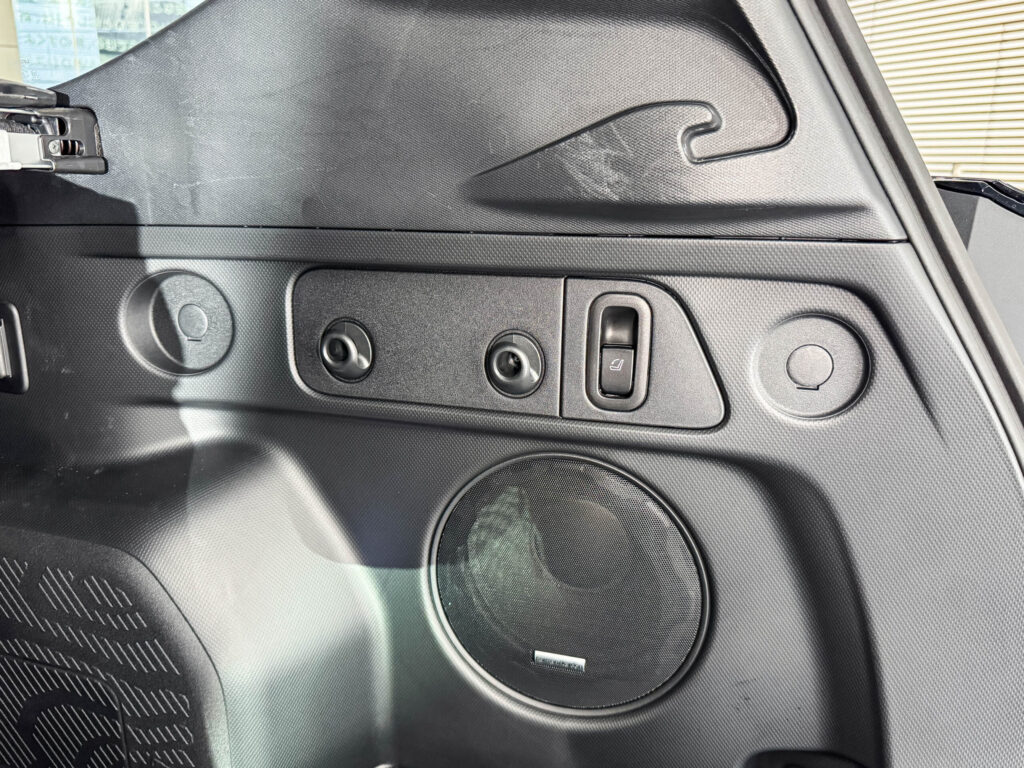 右側は後部座席を倒すレバーとフック、そして下にはオプションの高音質ハーマンカードンのスピーカーが見えます。