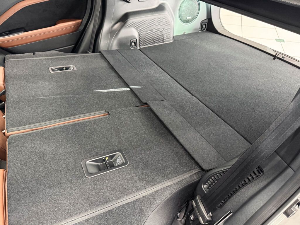 本革シート(ナッパレザー×ウルトラスエード®)を選択した展示車では、後席もPremiumらしいしっとりとした座り心地になっており、標準の撥水ファブリックとはまったく違う上質な空気感がありました。標準仕様のグレー×プラチナは機能性重視でアウトドアにも強い一方、本革仕様は室内の色味や加飾まで変わるため、よりラグジュアリーな空間に仕上がるのがこのグレードの大きな魅力です。
